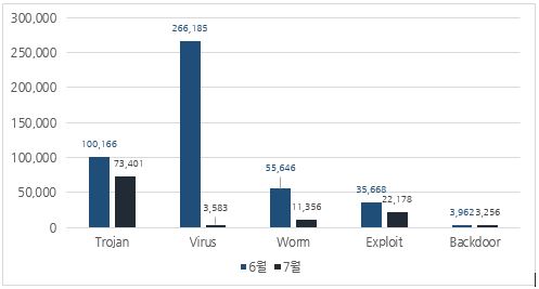 7월에는 악성코드 유형별로 6월과 비교하였을 때 Virus, Trojan, Worm, Exploit 및 Backdoor의 진단 수가 감소하였다.
