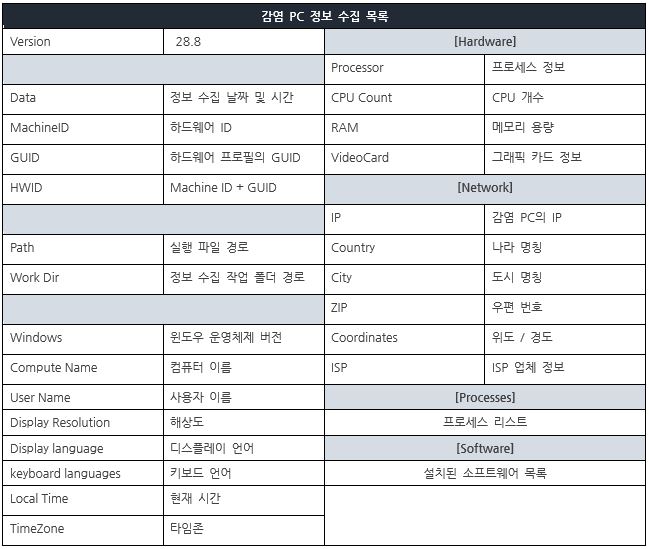 또한, 하드웨어, 네트워크, 프로세스 목록 등의 감염 PC 정보를 수집하여 ‘information.txt’ 파일에 저장한다. 아래 [표 2]는 정보 수집 목록이며, 네트워크 정보는 ‘ip-api.com/line’에서 데이터를 받아온다.