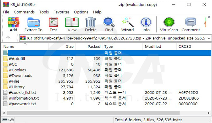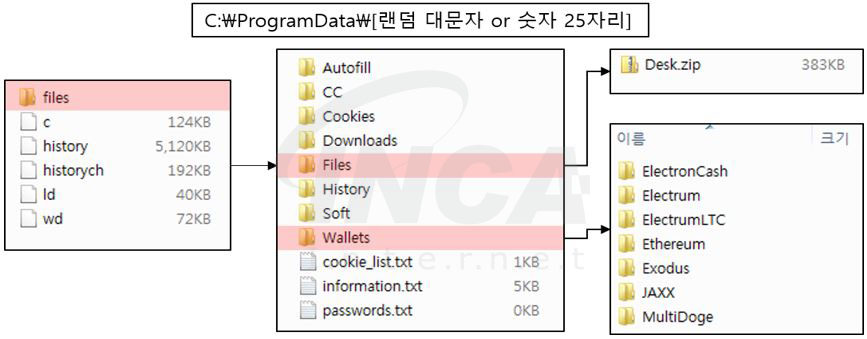 감염 PC에서의 정보 수집을 완료하면 “C:\ProgramData\[랜덤 문자열 25자리]\files”폴더를 ‘[국가]_[GUID].zip’란 이름으로 압축한다.