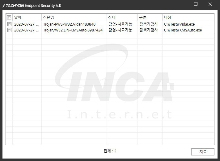상기 악성코드는 잉카인터넷 안티바이러스 제품 TACHYON Internet Security 5.0에서 진단 및 치료가 가능하다.