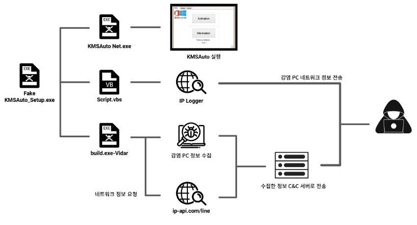 만약, 사용자가 비밀번호를 정상적으로 입력한 후, OK 버튼을 누르면 “C:\Program\Data” 에 3개의 파일이 드롭된다. 첫 번째 드롭 파일은 KMSAuto Net.exe v1.5.1 크랙판(KMSAuto Net.exe)이고, 두 번째 드롭 파일은 IP Logger를 사용하여 감염 PC의 네트워크 정보를 수집하는 스크립트 파일(script.vbs)이다. 마지막 드롭 파일인 ‘build.exe’는 정보 탈취를 하는 ‘Vidar’ 악성코드이고 감염 PC의 사용자 정보, 웹 브라우저 계정 정보 및 사용 이력, 암호 화폐 등의 다양한 정보를 수집하여 C&C 서버로 전송한다. 따라서, 사용자의 웹 브라우저 사용자 계정, 암호 화폐 등의 정보가 유출될 수 있으므로 사용에 큰 주의가 필요하다.