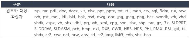 또한, [표 1]와 같이 특정 확정자 파일에 대하여 암호화 동작을 수행한다.