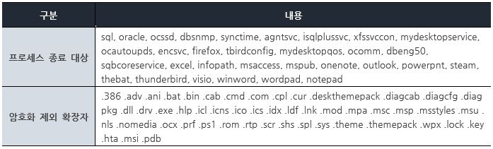 ‘DarkSide’ 랜섬웨어는 아래 [표 1]와 같이 특정 프로세스에 대해 종료를 먼저 진행하고, 기본적인 시스템 관련 파일 및 폴더와 특정 확장자를 제외한 모든 파일에 대해 암호화를 진행한 뒤 랜덤명의 확장자를 덧붙인다.