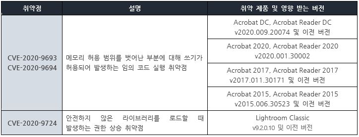 Adobe 사에서 보안 업데이트를 발표하고, 관련 취약점을 해결하기 위해 최신 버전으로 업데이트할 것을 권고하였다.