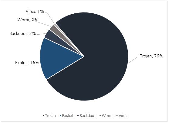 8월 한달 간 탐지된 악성코드를 유형별로 비교하였을 때 Trojan(트로잔)이 76%로 가장 높은 비중을 차지하였고, Exploit(바이러스)와 Backdoor(백도어)가 각각 16%와 3%, Worm(웜)과 Virus(바이러스)가 각각 2%, 1%씩으로 그 뒤를 따랐다.
