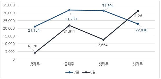 8월 한달 동안 악성코드 진단 현황을 주 단위로 살펴보았을 때 7월에 비해 감소한 추이를 보이고 있다.