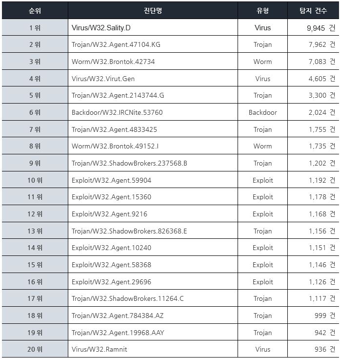 8월에는 악성코드 유형별로 7월과 비교하였을 때 Virus, Worm 및 Backdoor의 진단 수가 증가하였고, Trojan과 Exploit의 진단 수가 감소하였다.