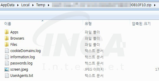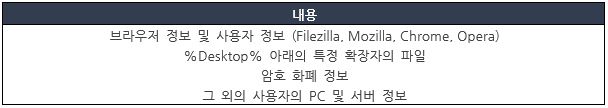 하기의 이미지, 표와 같이 사용자 PC에 저장되어 있는 다양한 정보를 탈취한다.