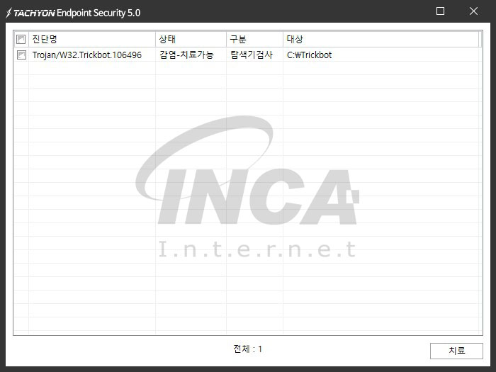 위의 악성코드는 잉카인터넷 안티바이러스 TACHYON Endpoint Security 5.0 제품에서 진단 및 치료가 가능하다.