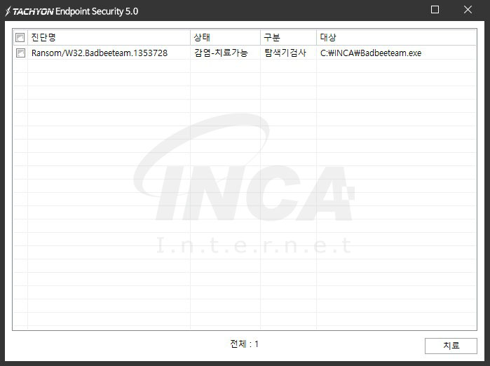상기 악성코드는 잉카인터넷 안티바이러스 제품 TACHYON Endpoint Security 5.0에서 진단 및 치료가 가능하다.