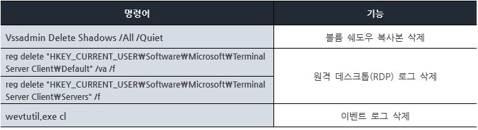 파일 암호화 이후 ‘사용자 폴더\AppData\Roaming\Microsoft\Visio’ 경로에 “start_after.bat” 배치파일을 생성 및 실행한다. 실행된 배치 파일을 통해 시스템 복구 무력화 및 원격 데스크톱 로그 등을 삭제한다.