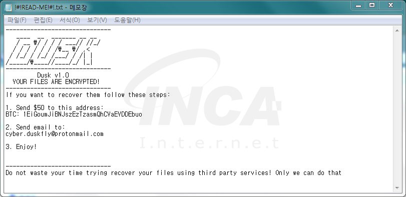 “Dusk” 랜섬웨어는 암호화가 완료된 폴더에 “!#!Read_ME!#!.txt”란 이름의 랜섬노트가 생성되어 감염 사실 및 복구를 위한 몸값 지불 경로를 안내한다.