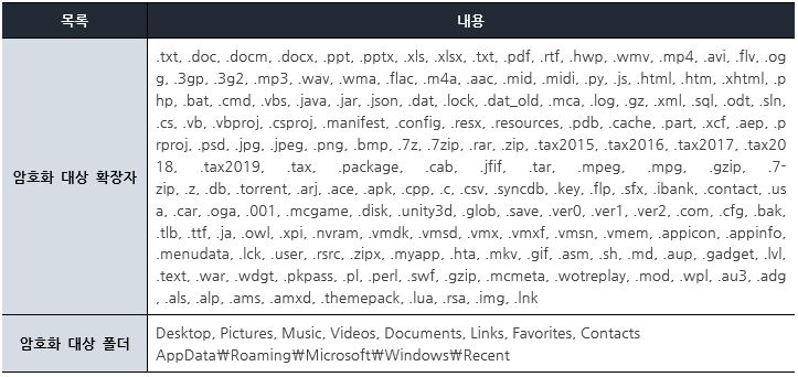“Dusk” 랜섬웨어의 암호화 대상 경로는 ‘%USERPROFILE%’이며, [표 1]에 기재된 확장자에 해당하는 파일을 암호화한다.