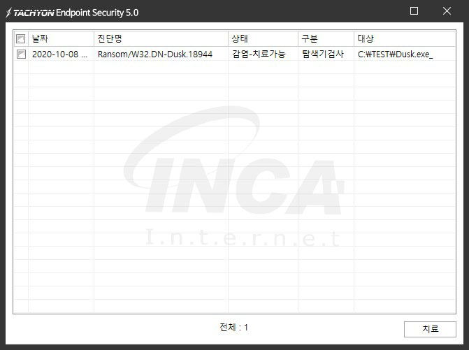 상기 악성코드는 잉카인터넷 안티바이러스 제품 TACHYON Internet Security 5.0에서 진단 및 치료가 가능하다.