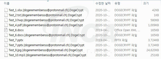 “DogeCrypt” 랜섬웨어 실행 시, C 드라이브의 파일을 검색하여 [표 1] 암호화 대상 목록의 조건에 부합하는 파일을 암호화하고 “[dogeremembersss@protonmail.ch] .DogeCrypt” 확장자를 덧붙인다.