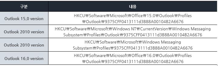 Outlook 을 사용중인 사용자라면 아래의 레지스트리 키 경로에 저장되어있는 사용자의 계정정보를 획득한다.