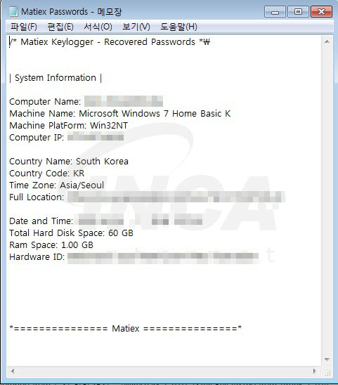 ‘Matiex Keylogger’가 실행되면 사용자의 PC 정보를 획득한 뒤, 텍스트 파일로 생성한다.