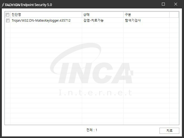 상기 악성코드는 잉카인터넷 안티바이러스 제품 TACHYON Internet Security 5.0에서 진단 및 치료가 가능하다.