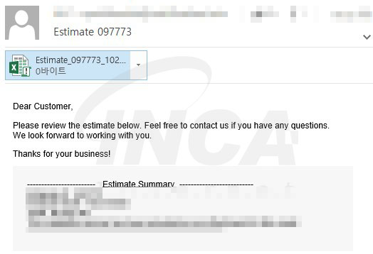 아래의 피싱 메일은 파일이 첨부된 인보이스를 사칭한 메일이다. 해당 메일은 주문 내역과 함께 첨부 파일 문서를 숙지해 달라는 내용으로 첨부파일 실행을 유도하고 있다.