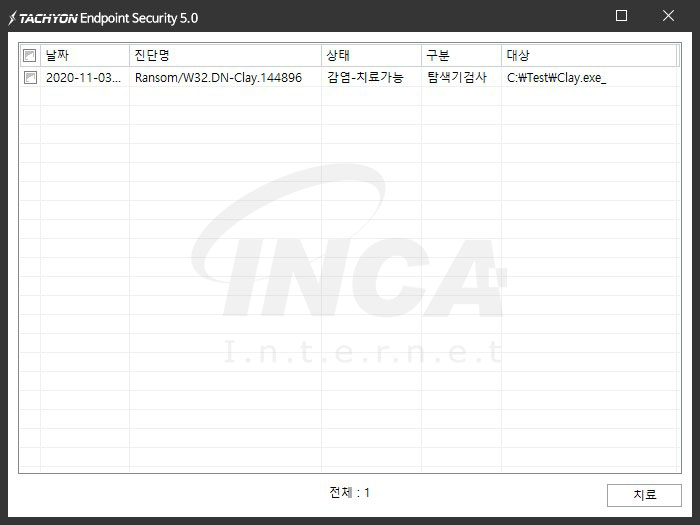 상기 악성코드는 잉카인터넷 안티바이러스 제품 TACHYON Internet Security 5.0에서 진단 및 치료가 가능하다.