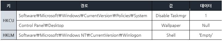 랜섬노트 창을 실행 직후 레지스트리 값을 변경하여 사용자가 랜섬웨어를 강제 종료할 수 없도록 작업관리자를 비활성화 한다. 또, 재부팅시 제대로 된 부팅이 이루어지지 않아서 사용자의 PC 사용을 불가능하게 한다.