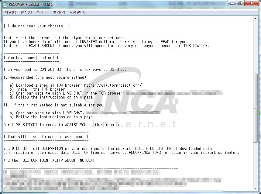 “TechandStart” 랜섬웨어는 암호화가 완료된 폴더에 “read_me_lkd.txt”란 이름의 랜섬노트를 생성하여 감염 사실 및 복구를 위한 몸값 지불 경로를 안내한다.