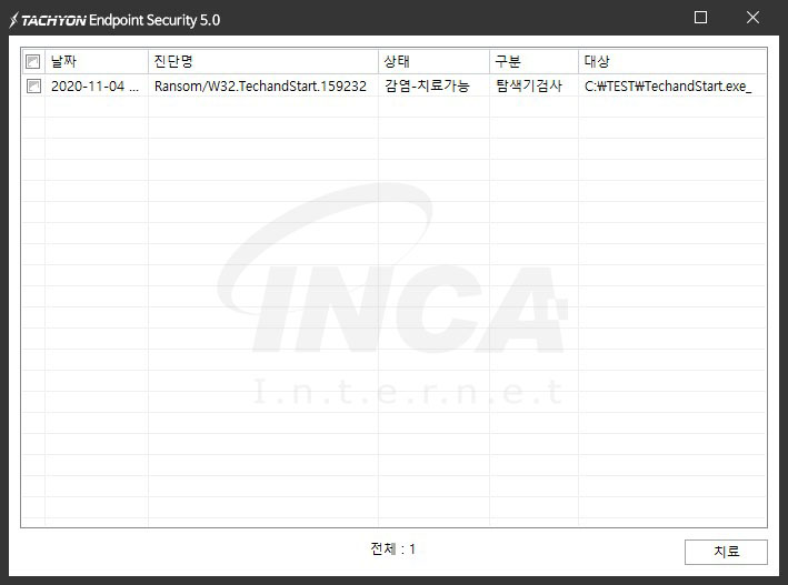 상기 악성코드는 잉카인터넷 안티바이러스 제품 TACHYON Internet Security 5.0에서 진단 및 치료가 가능하다.