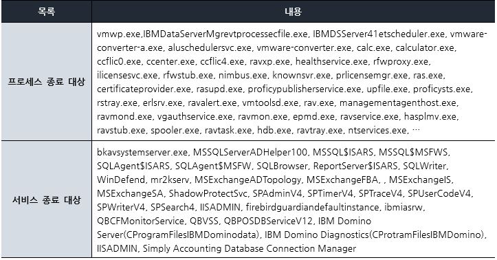 다음으로, 원활한 악성 동작을 위해 실행 중인 프로세스 및 서비스 목록을 확인하여 Hyper -V 사용시 생성되는 vmwp.exe 외 1104개 프로세스와 [표 2]에 해당하는 서비스를 종료한다.