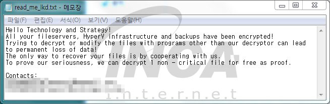 최근 파일 서버 또는 Hyper-V를 사용하는 사용자를 공격하는 “TechandStart”라는 새로운 랜섬웨어가 발견되었다. 해당 랜섬웨어에 감염되면 시스템 구동에 필요한 폴더를 제외한 모든 경로에 대해 암호화를 진행한다. 암호화 전, 원활한 감염을 위해 Hyper-V나 파일 서버와 관련된 프로세스 및 서비스를 종료하며 그 후, 파일 암호화가 진행된다. 암호화가 완료되면 파일에는 “.crypted”란 확장자가 추가되고, “read_me_lkd.txt”란 이름의 랜섬노트가 생성되어 파일 복구와 관련된 정보를 얻을 수 있다.