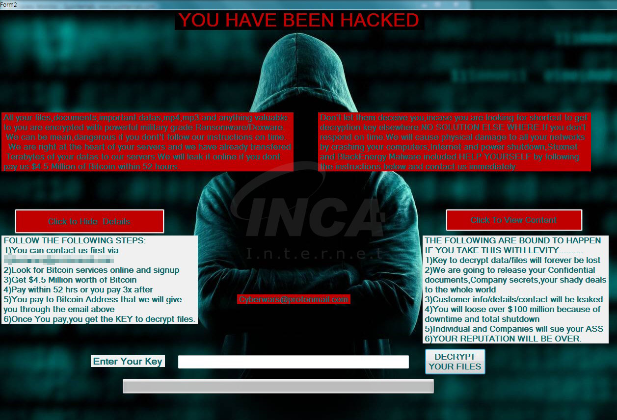 10월 초, 파일을 암호화한 후 화면을 잠그는 “Nibiru” 랜섬웨어가 발견되었다. 해당 랜섬웨어가 실행되면 파일 암호화가 진행되며 암호화된 파일은 “.Nibiru” 라는 확장자가 붙는다. 또한, 사용자가 화면 잠금을 종료하지 못하도록 작업관리자를 실행할 수 없게 설정한다. 그 후, 화면을 잠그고 랜섬 노트를 띄워 $4,500,000의 랜섬머니를 요구한다.