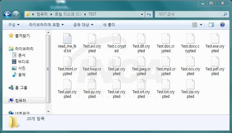 해당 샘플이 실행되면 파일 암호화가 진행되며, 암호화가 완료된 파일은 [그림 8]과 같이 파일 이름에 “.crypted ” 확장자가 추가된다.