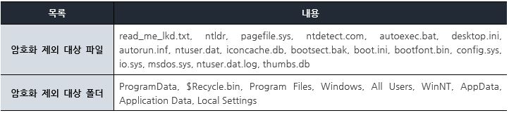 암호화 대상은 [표 1]과 같으며, 시스템 구동에 필요한 파일 및 폴더를 제외한 모든 파일이다.