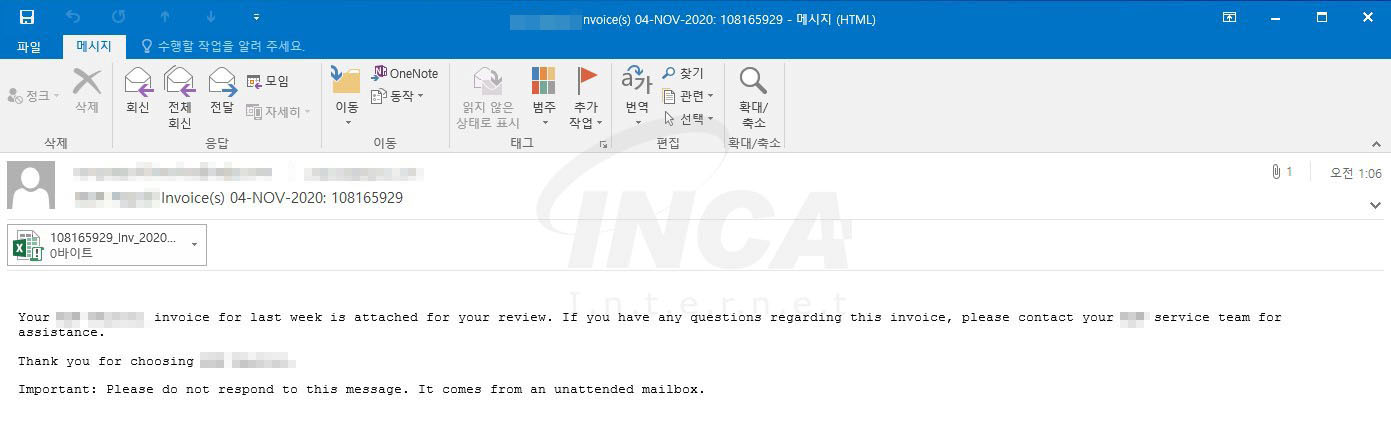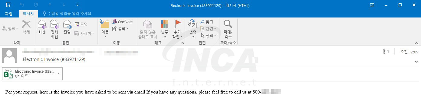 아래의 피싱 메일은 역시 특정 기업을 사칭한 피싱 메일이다. 해당 메일은 인보이스를 확인한 후 질문 사항이 있으면 전화를 달라는 내용으로 실제 전화번호를 기재한 것이 특징이다. 이렇게 전화번호를 밝힘으로써 사용자로부터 의심을 피할 수 있다. 첨부된 파일은 역시 악성 파일로 매크로를 통한 감염이 이루어진다.