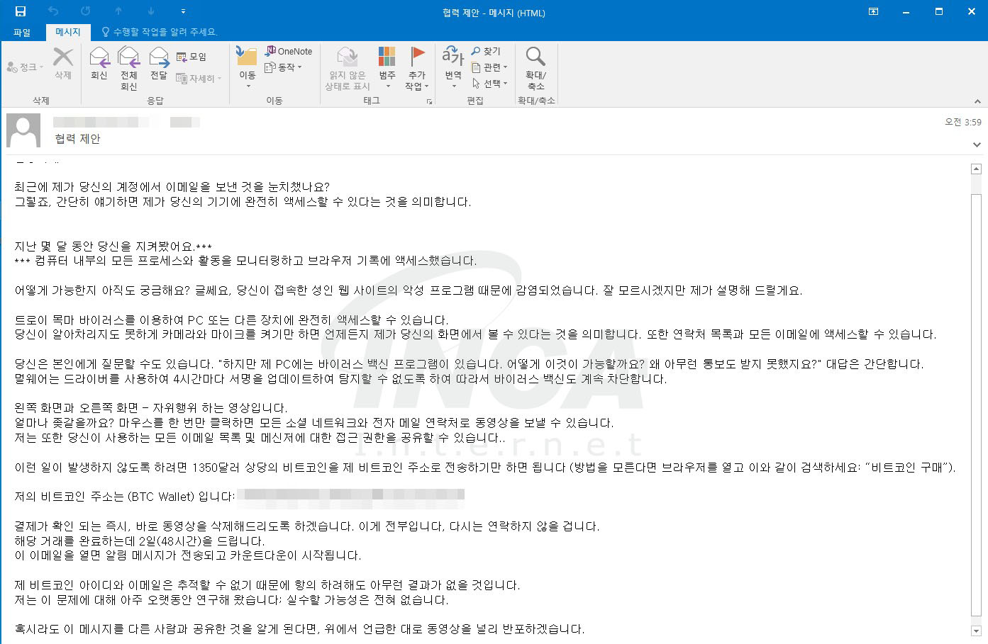 아래의 피싱 메일은 최근 불특정 다수에게 유포된 혹스(Hoax) 메일이다. 해당 메일은 사용자가 방문했던 성인사이트에 의해 감염되어 사용자의 은밀한 영상을 유포하겠다는 내용으로 사용자의 심리를 자극하여 협박하며 금전을 요구하고 있다. 또, 발신자가 사용자 메일 계정으로 되어있음을 강조하여 사용자가 해킹당했음을 인지시키고 있지만 이는 속임수를 사용한 것이다.