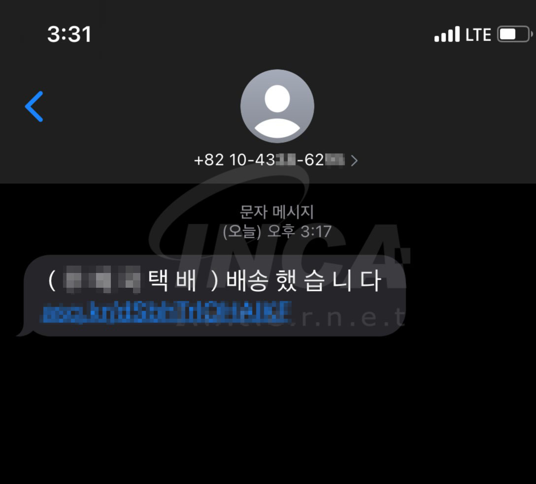 아래의 피싱 문자는 링크가 첨부된 택배 회사를 사칭한 문자이다. 해당 문자의 내용은 사용자들이 자주 사용하는 택배 회사명과 함께 첨부된 링크의 클릭을 유도하고 있다.