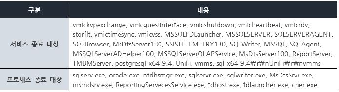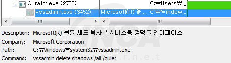“Curator” 랜섬웨어 실행 시 시스템의 볼륨 섀도우 복사본을 삭제하여 복원을 불가능하게 만든 뒤, 아래 [표 1] 목록의 서비스와 프로세스를 검색하여 종료시킨다.