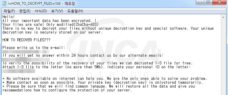 파일 암호화 이후, “!=HOW_TO_DECRYPT_FILES=!” 랜섬노트를 생성하여 사용자에게 감염 사실과 복구 방법을 통보한다.