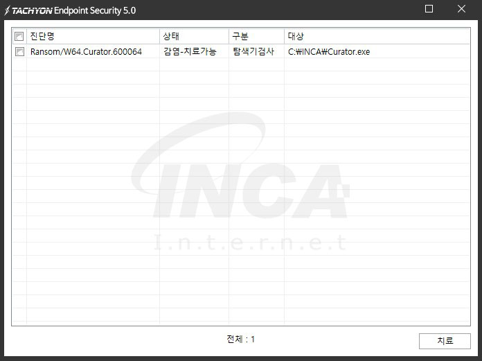상기 악성코드는 잉카인터넷 안티바이러스 제품 TACHYON Endpoint Security 5.0에서 진단 및 치료가 가능하다.