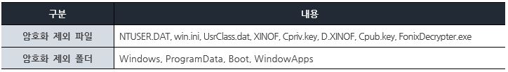 “Fonix” 랜섬웨어에 감염되면 [표 1]의 해당 랜섬웨어와 관련된 파일 및 중요한 윈도우 OS폴더를 제외한 모든 확장자의 파일이 암호화 된다.