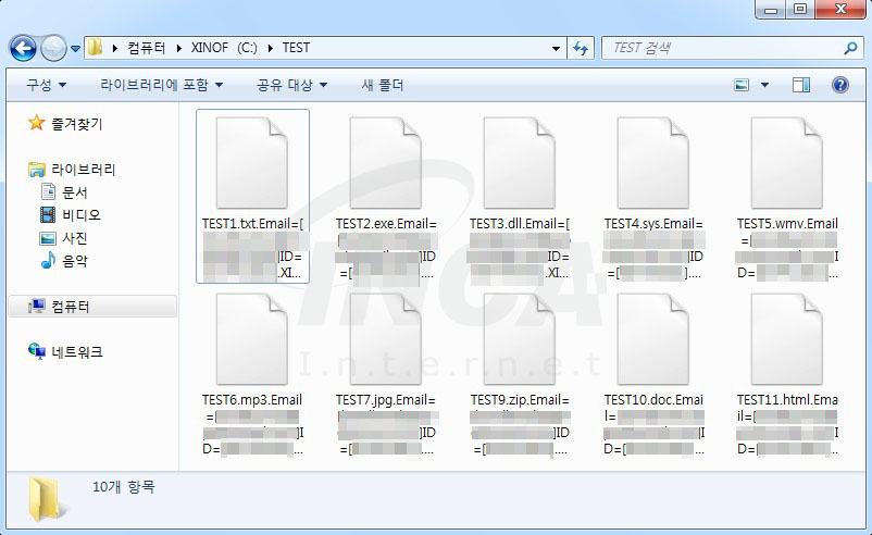 암호화 이후 로컬 드라이브의 이름을 XINOF로 바꾸고, 감염된 파일명의 확장자 뒤에 “.Email=[Email Address]ID=[UserID].XINOF” 라는 이름의 확장자를 덧붙인다.