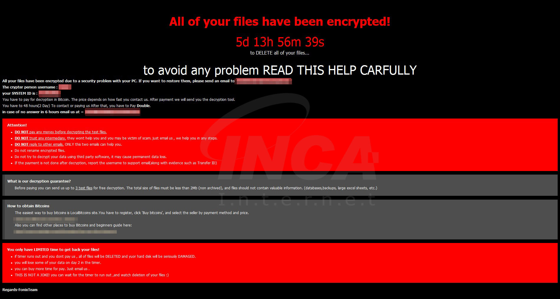 최근 "Fonix” 랜섬웨어가 발견되었다. ‘Fonix’ 랜섬웨어는 특정 파일 및 폴더를 제외한 모든 파일에 대해 암호화를 하고, 랜섬노트를 띄운 후 피해자에게 몸값을 요구한다. 또, 사용자가 PC를 다시 복구할 수 없도록 하며 중요한 윈도우 OS폴더를 제외한 모든 확장자를 대상으로 암호화가 이루어지므로 사용자의 주의가 필요하다.