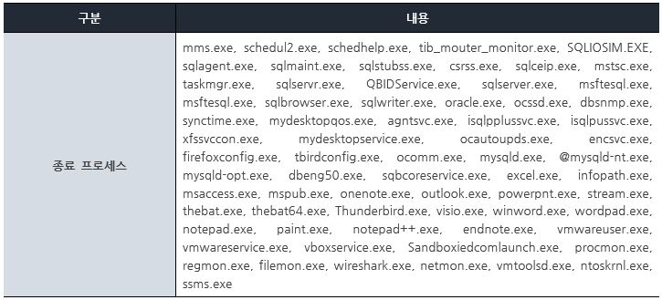 해당 랜섬웨어는 암호화 이전에 사용자가 자주 사용할 만한 프로세스를 강제로 종료 시킨 후 암호화하여 PC이용에 제한을 준다.