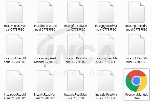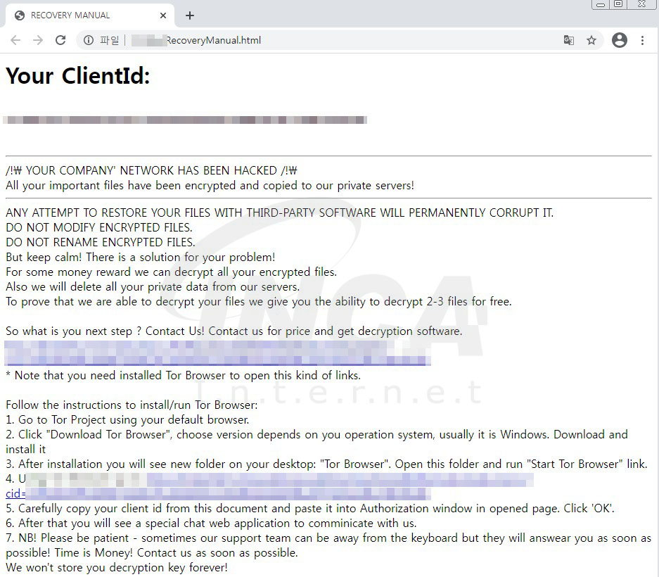 파일 암호화가 완료된 폴더에는 “RecoveryManual.html” 랜섬 노트를 생성하고, 사용자에게 암호화된 파일에 대해 금전을 요구한다.