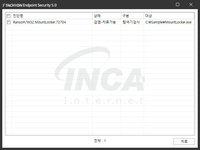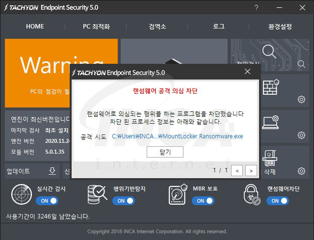 TACHYON Endpoint Security 5.0 제품의 랜섬웨어 차단 기능을 이용하면 사전에 파일 암호화 행위를 차단할 수 있다.