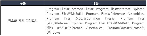 하기의 표와 같이 OS 운영과 관련된 디렉토리를 제외하고 C드라이브에 대한 모든 파일을 대상으로 암호화 동작을 수행한다.