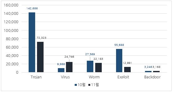 11월에는 악성코드 유형별로 10월과 비교하였을 때 Virus의 진단 수가 증가하였고, Trojan, Worm, Exploit 및 Backdoor의 진단 수가 감소하였다.