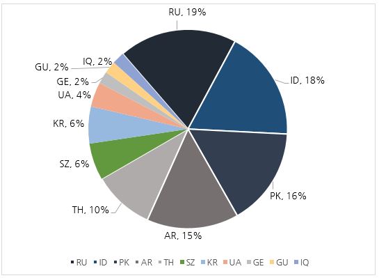 11월 한달 간 탐지된 랜섬웨어를 국가별로 비교하였을 때 러시아(RU)가 19%로 가장 높은 비중을 차지하였고, 인도네시아(ID)와 파키스탄(PK)이 각각 18%와 16%, 태국(TH)과 아르헨티나(AR)가 각각 15%와, 10%씩으로 그 뒤를 따랐다. 국내 랜섬웨어 감염 비율은 자사 진단 대비 6%를 차지하였다.