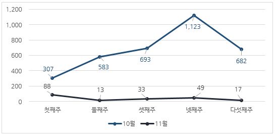 11월 한달 동안 악성코드 진단 현황을 주 단위로 살펴보았을 때 10월에 비해 감소한 추이를 보이고 있다.
