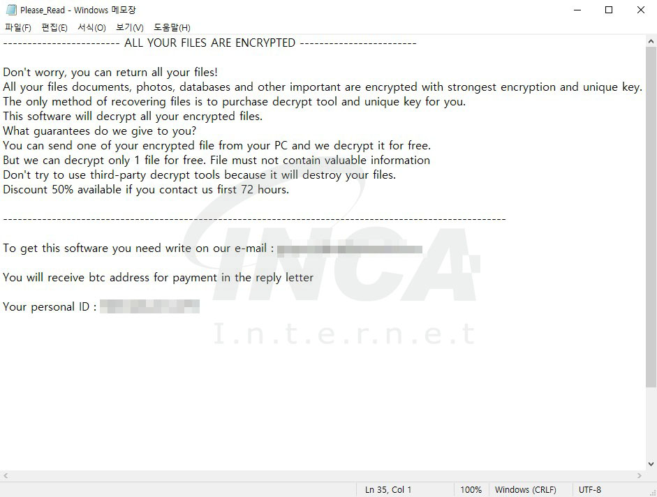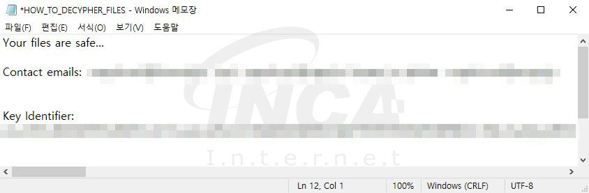 추가적으로 암호화 대상 폴더에 ‘HOW_TO_DECRYPHER_FILES.txt’ 라는 랜섬노트를 바탕화면에 생성하여 사용자에게 감염 사실을 알린다.