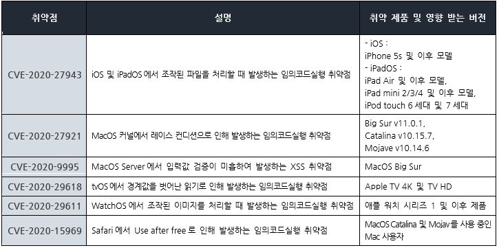 Apple사에서 자사 제품의 보안 업데이트를 발표하고, 관련 취약점을 해결하기 위해 최신 버전으로 업데이트할 것을 권고하였다.